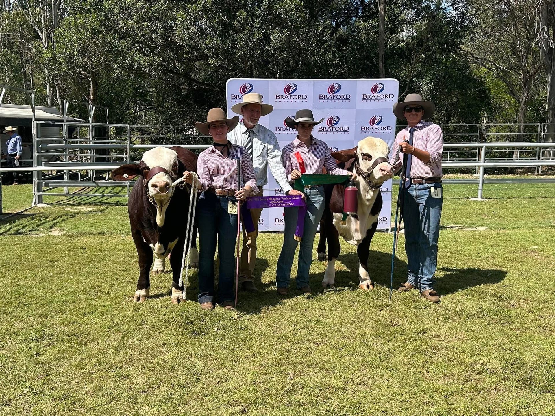 Day 2 (Saturday) saw the Brafords back at it again with all breeds of cattle judged in together as one in all respective classes for the Mount Perry show. After success in Dalby only last week, MCN Hermione won Supreme Exhibit of the Show after winning Champion Female and beating her stable mate MCN Brigadier (12 months old) who was sashed Champion Male of the Show. Finished the day with a win in the Breeders Group. Thank you once again to all the kind and generous sponsors for your support.